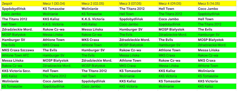 Mecze gramy poniedziałek czwartek sobota.
