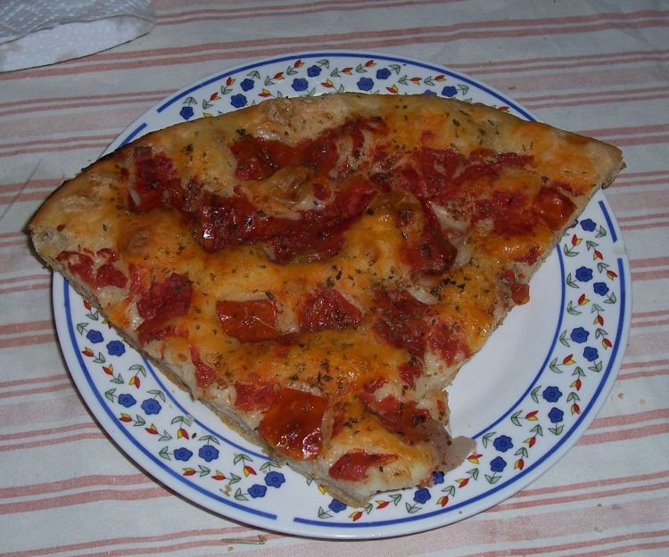 se la mozzarella può rappresentare una fonte di dubbio allora consideriamo la pizza al taglio, quella casareccia, senza mozzarella...non so se si fa anche da voi