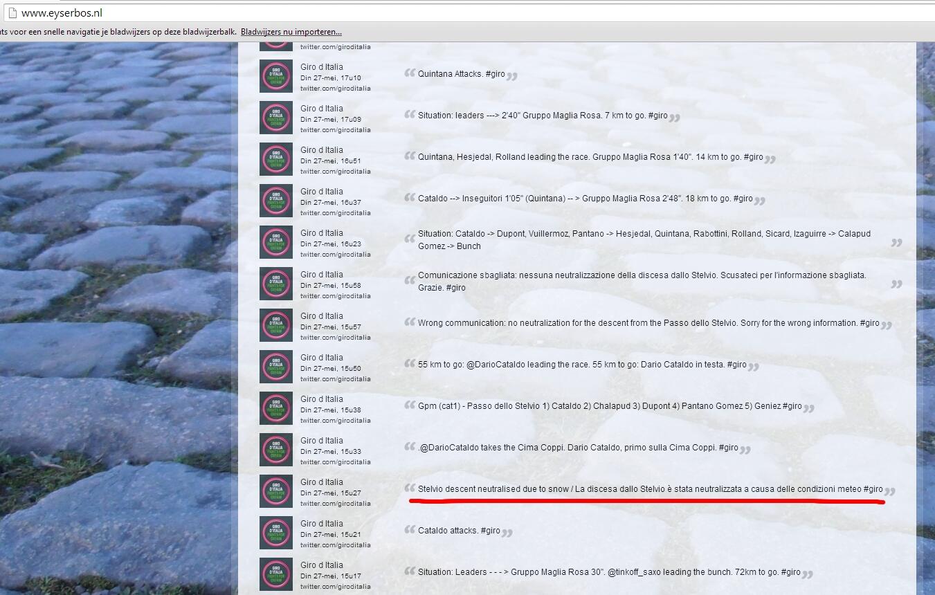 Daar zit wat in. Maar ja, sommige teams zeggen van wel, sommige teams van niet. Al bij al moet zoiets duidelijk zijn. Verschillende renners stapten af op de top van de Stelvio om rustig hun jasje aan te doen en wat eten mee te pakken, dat doe je niet als je daadwerkelijk denkt in koers te zijn. Ik vind het in elk geval zeer amateuristisch van de organisatie. Daniel Lloyd (die de interviews doet achteraf) tweette zelfs dat de afdaling geneutraliseerd was. Als dan blijkt dat er miscommunicatie is kan je als organisatie de situatie nog herstellen, ik kan me ook niet voorstellen dat iemand blij is om op deze manier de Giro te winnen.