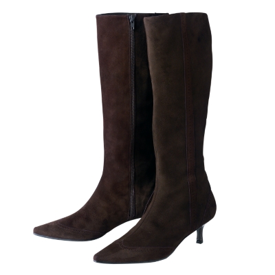 Lange brune støvler med 10,8-11,0 cm høje, sylespidse hæle.