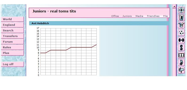 A side note for all us poor people who haven't got plus (definately recommended). Using the above technique (and a program which can show talent of juniors e.g. Apollo, Sokker Organiser etc. [N.B. links to these programs can be found in the Sokker International forums]) , the talent can be pasted into a transfer topic on the relevant transfer forums (see Transfers England/Transfers International for examples) to allow people to see the talent of your player.